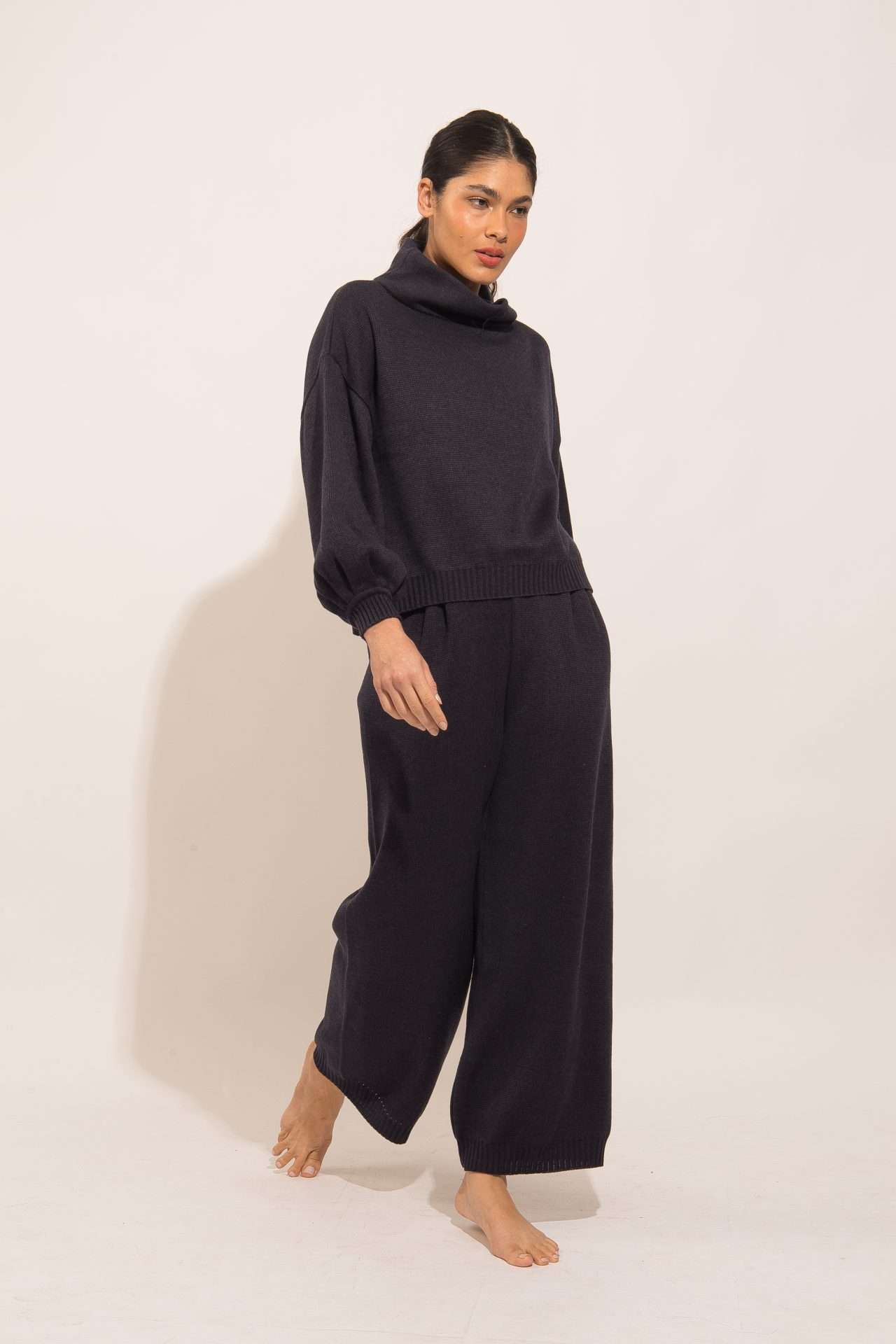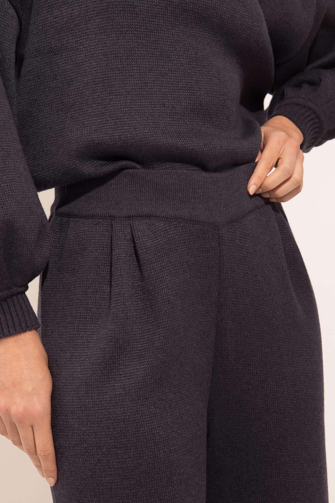 A calça Kátia é feita em tricot e tem modelagem reta e ampla.
