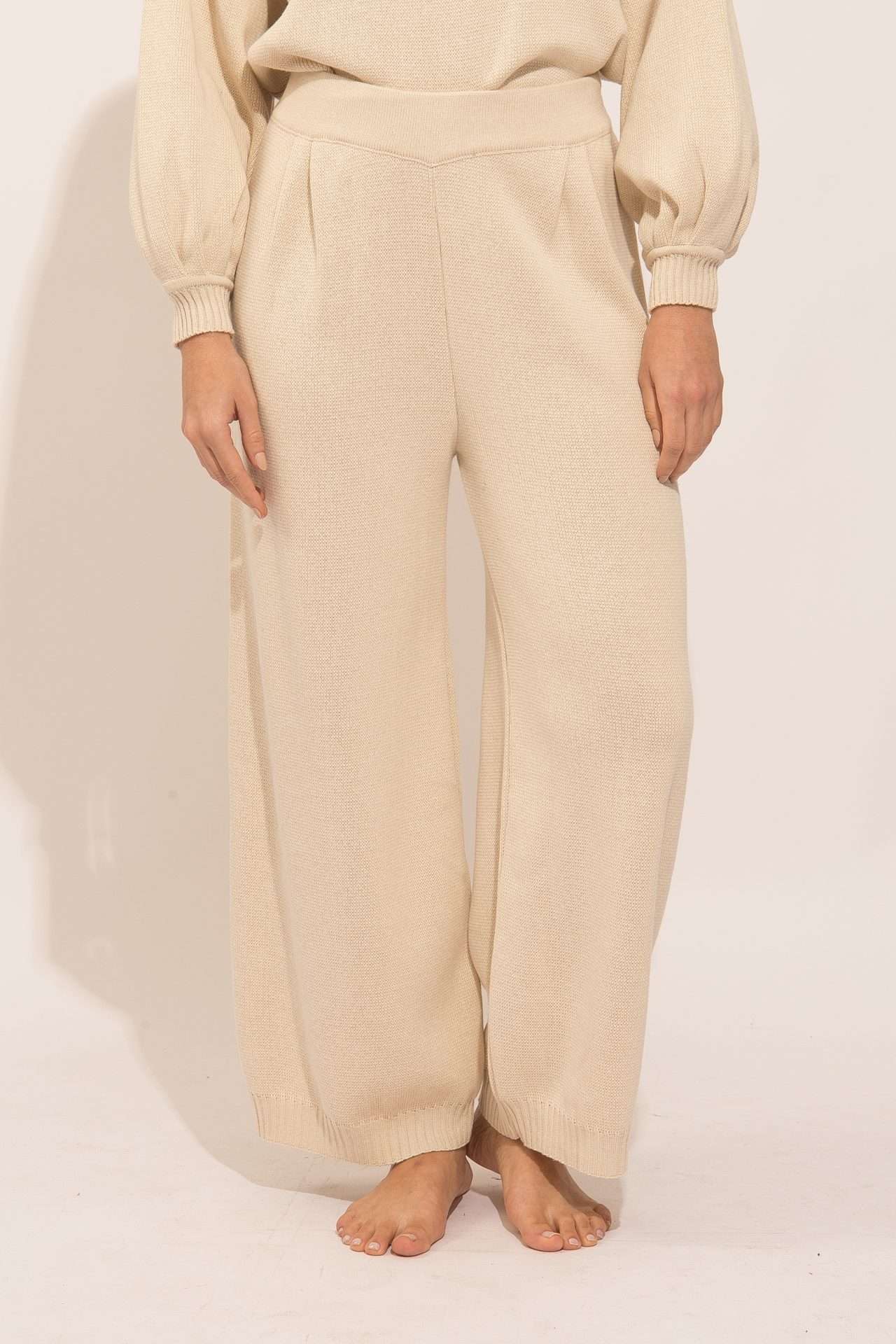 A calça Kátia é feita em tricot e tem modelagem reta e ampla.