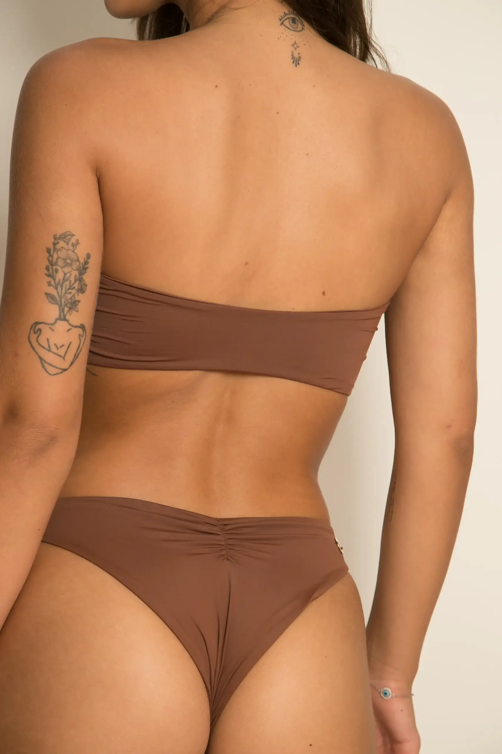 A calcinha é média, com laterais fixas. Na parte de trás, ligeiro franzido com costura embutida.