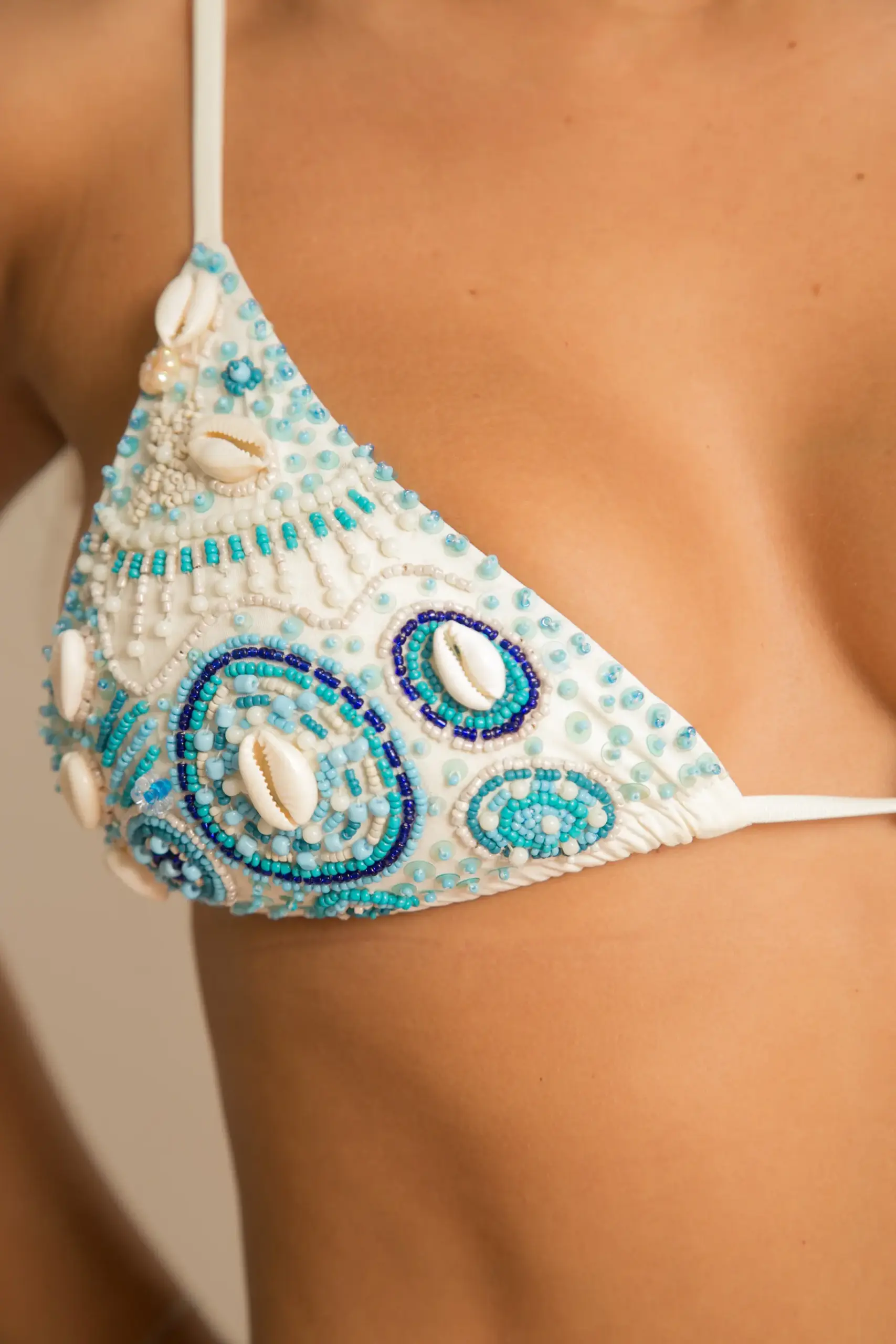 Top e calcinha bordados artesanalmente com miçangas e búzios.